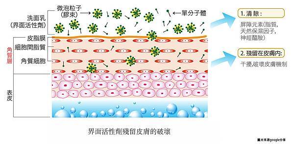 界面活性劑屬於陰離子型介面活性劑,其可溶於油又可溶於水的功能。因為它可以吸附油脂,又融於水的特性,用大量的水沖洗來帶走油脂,而達到清潔的效果。因價格低廉方便操作又可大量生產,故市售大部分的清潔劑、化妝品、清潔保養品、洗髮精、牙膏都會利用介面活性劑來達到清潔效果。但介面活性劑本身會造成皮膚刺激性;因為介面活性劑會洗去肌膚的皮脂膜而失去保護之功能,造成皮膚通透性之增加而暴露於汙染源。若介面活性劑與角質結合,加上蛋白質之變性,而引起皮膚之刺激性反應問題。