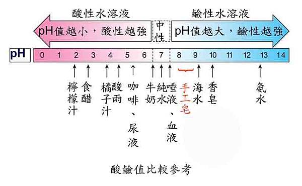 生活中常利用酸或鹼來殺菌清潔,而強酸和強鹼都具有腐蝕性,因此社會新聞有人用強酸或強鹼來自殺,可見強酸和強鹼都能置人於死地,所以要避免皮膚的碰觸。製作手工皂過程中確實必須使用鹼,將油脂皂化成肥皂,而熟成過程必須經過4至6周的時間,就是讓鹼完全轉化呈現穩定衰歇的原故。一般香皂的pH值通常在10左右,而手工皂熟成後介於8至9之間,故香皂具有較強的清潔力,因此洗後皮膚會有乾澀的現象。