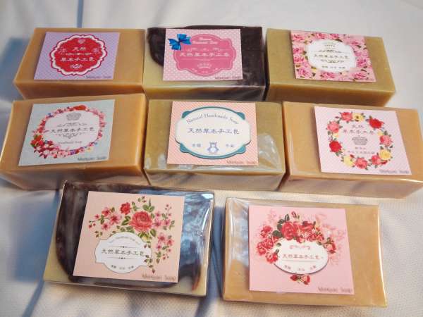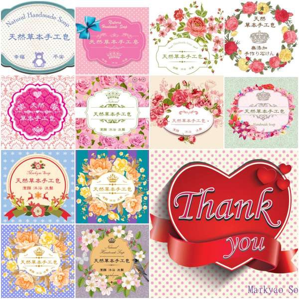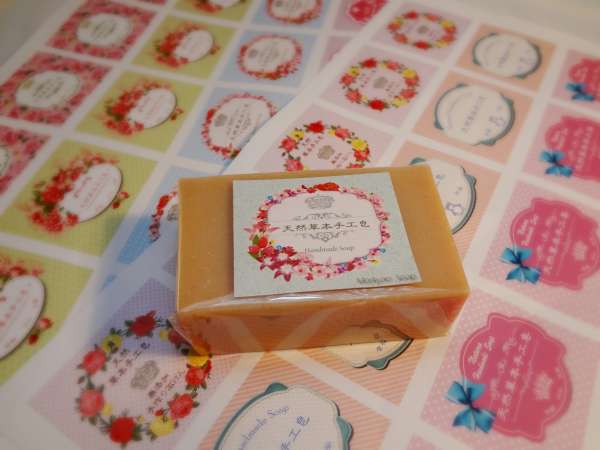 圖樣主題各式花卉大多採用粉紅色背景,配上歐式風格的彩繪與插圖,雖然不是美工背景的技巧手法,但是選圖配色也花了許多功夫咧!由於草本冷製手工皂的色澤大都不是亮麗的,貼上這標籤僅彌補先天外觀的缺陷而已,重要的還是回歸「手工皂」的本質,油脂的優劣與油品組合得宜與否。