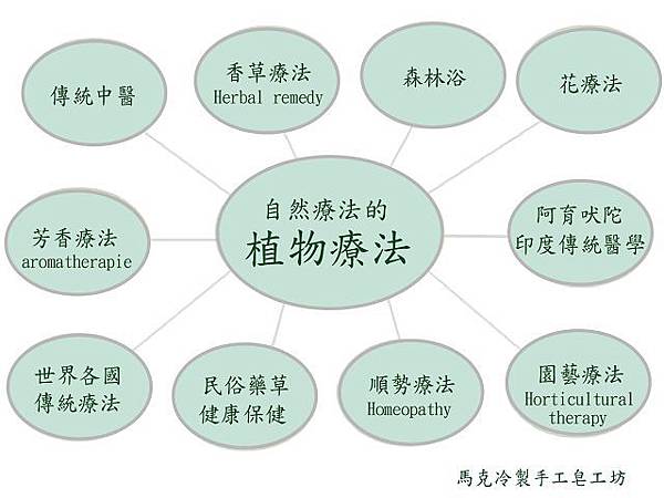 植物療法在歐美被廣泛使用的另類醫療或稱輔助醫療。植物療法與中國傳統醫學採用植物來治病相似,但有別於大家熟悉中醫利用植物煎煮性味或泡製的中藥,注重治病或調理養身。歐洲通常是將植物經過蒸餾、萃取來調製植物的藥理;利用各種植物來療癒心理、生理、病理的難題,帶給精神上的愉悅放鬆情緒,以達到治療的效果。彙整輔助醫療各種方式如下圖,可發現植物的功能非常廣泛,在我們生活當中除了芳香療法,還有其他利用植物的療癒方式。